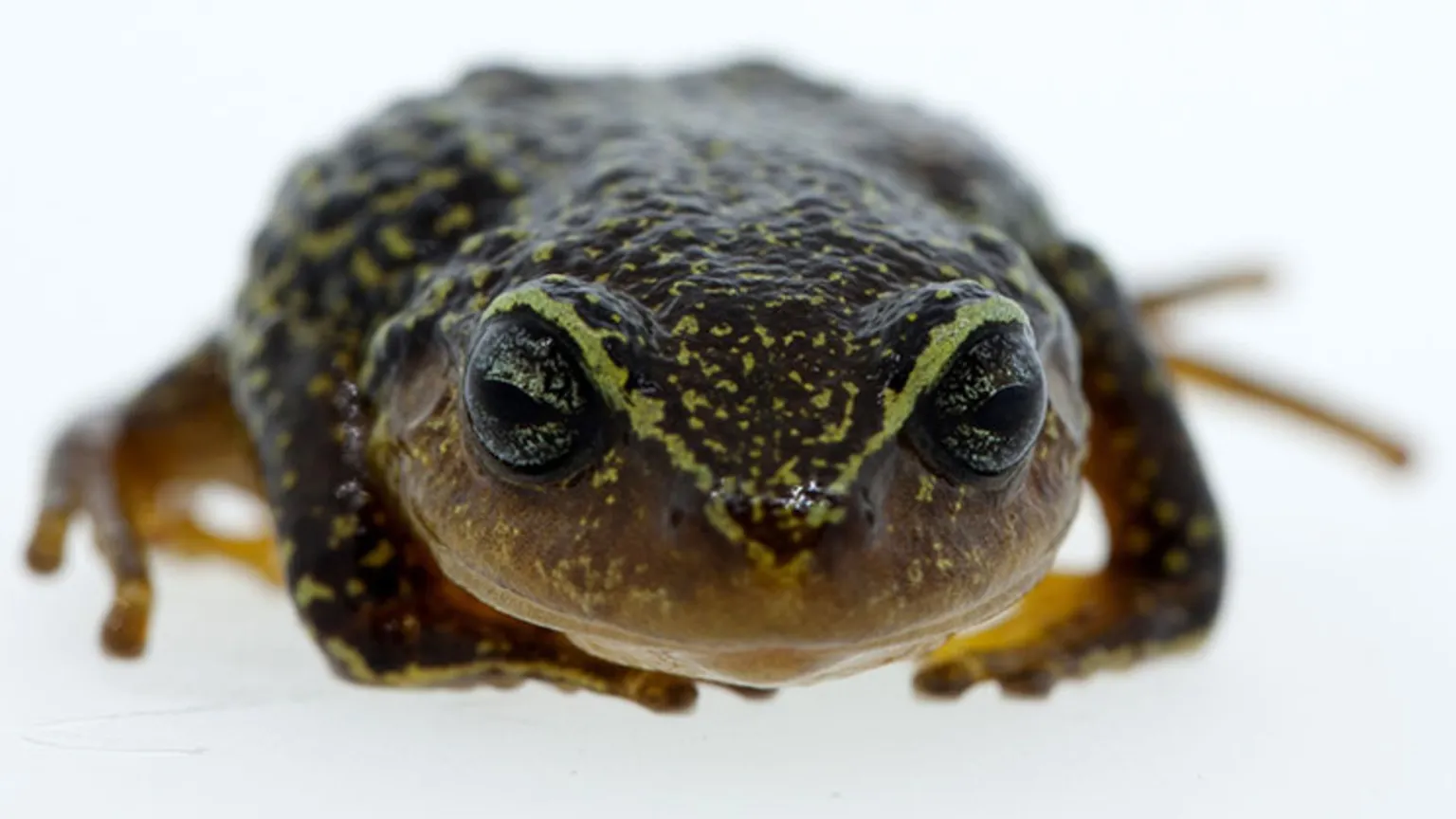 Hij leeft voornamelijk 's nachts, voelt zich thuis in een moeras, is twee keer zo klein als zijn vrouwtje en heeft gele strepen op zijn kop. Zo ziet de nieuwe kikker eruit die in Colombia is ontdekt.