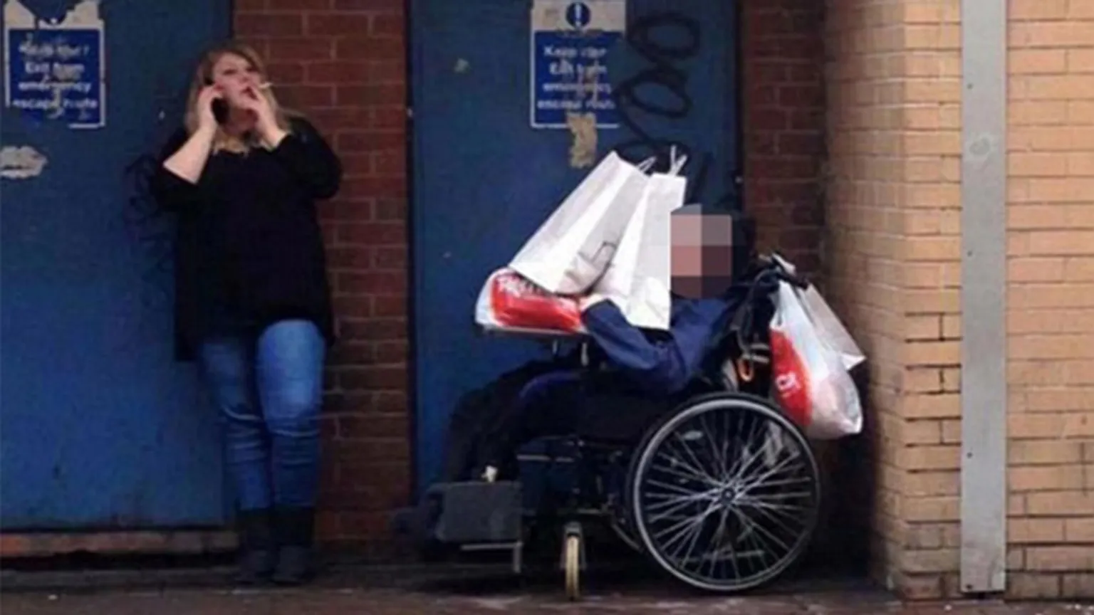 Op facebook verscheen gisteren een foto, gemaakt in Leicestershire, door een voorbijganger. We zien een vrouw die tegen een muur geleund en sigaretje staat te roken. Ze is druk aan het bellen. Naast haar een zwar gehandicapte man in een rolstoel, helemaal bedolven onder de boodschappentassen..