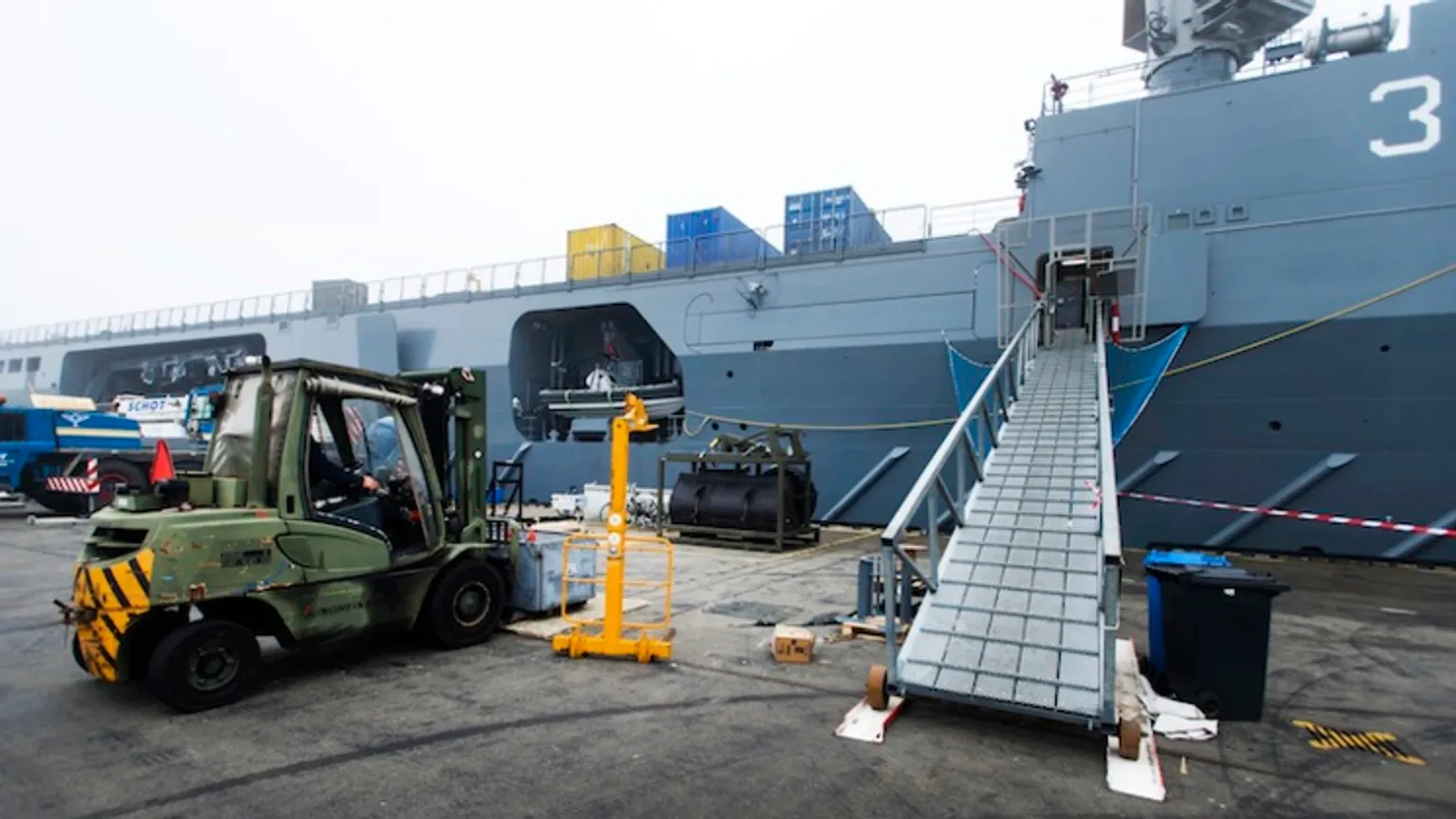 In Den Helder en een aantal andere havens worden de spullen geladen. De reis naar de kustwateren van West-Afrika zal zo'n twee weken duren.
