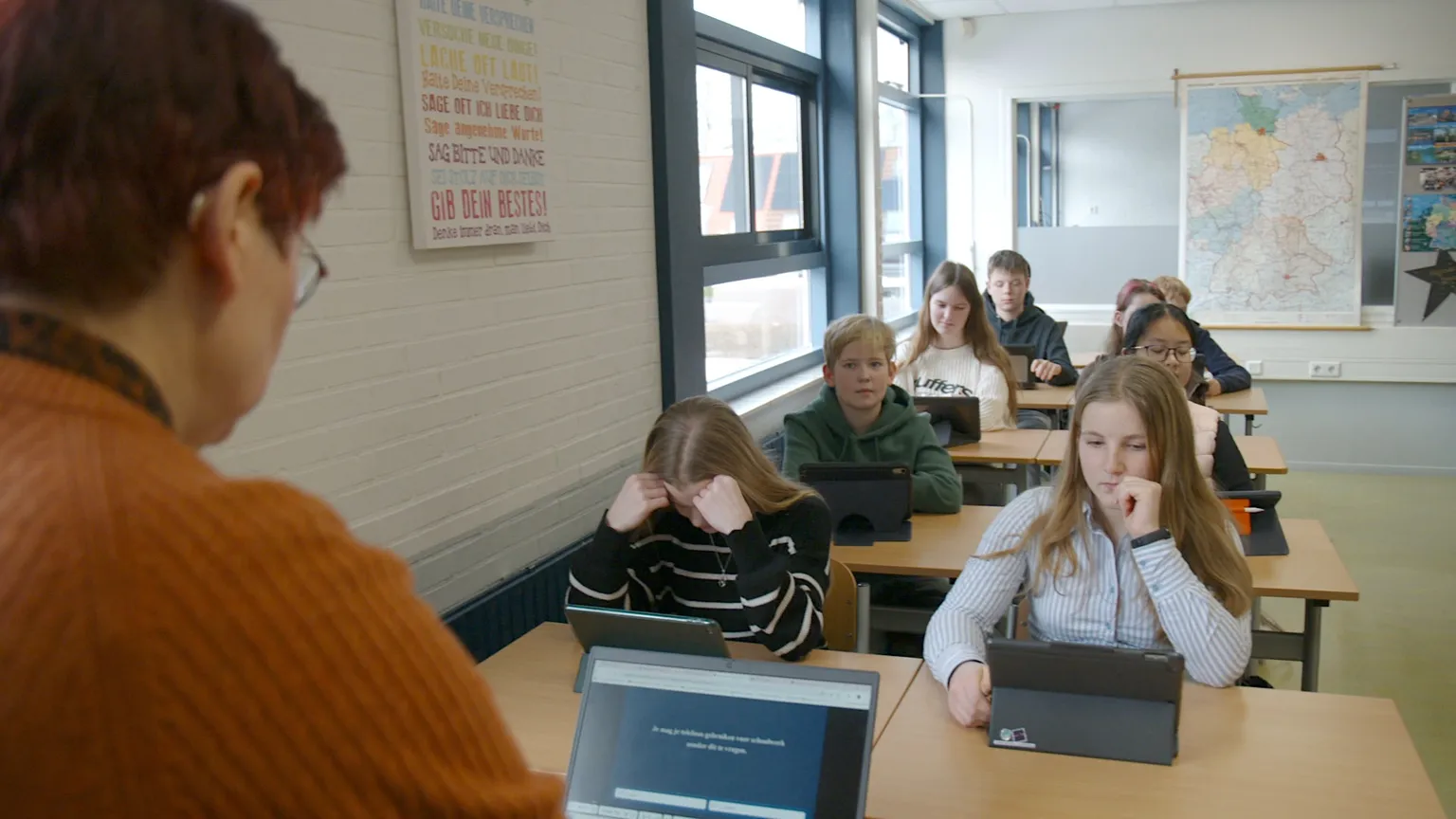 Inmiddels zijn de leerlingen gewend aan het mobieltjesverbod. "Je moet gewoon duidelijk zijn", zegt hun docent Duits Grietje Bekker.