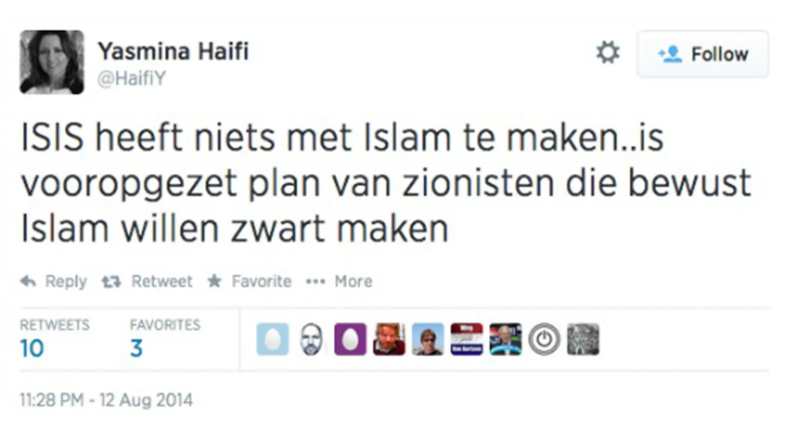 Volgens Yasmina Haifi is de terreurorganisatie ISIS 'een project van zionisten die bewust Islam zwart willen maken'. Dat twitterde ze gisteravond in een inmiddels weer verwijderde tweet.