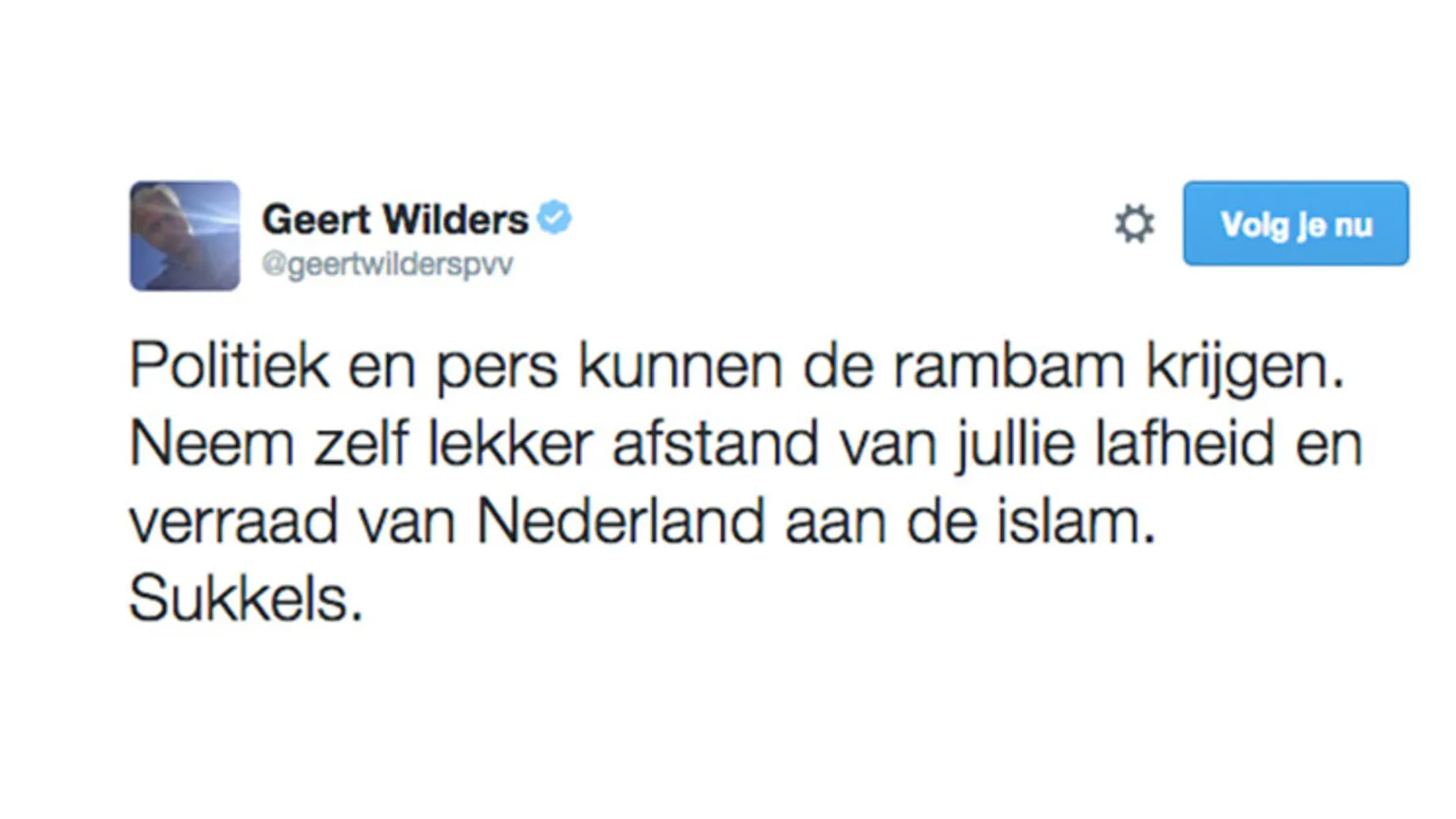 De kerstboodschap van Wilders, die ons land heeft verlaten voor een welverdiende vakantie, luidde als volgt: 'krijg allemaal het rambam'.