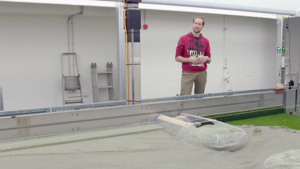 In een bak met zand en water in het lab van Weisscher wordt de eb- en vloedstroming in de Waddenzee nagebootst. Via een buisje aan de rand van de bak komen er zaadjes van planten in het water terecht. En wat blijkt: langzaam maar zeker wordt de bodem opgehoogd met zand, slib en planten.