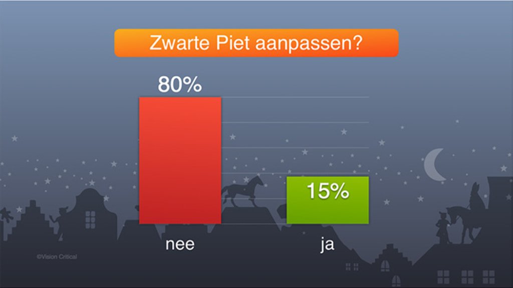Ook dit jaar vindt een ruime meerderheid (80%) dat het uiterlijk van Zwarte Piet niet moet worden aangepast. Dat blijkt uit onderzoek van EenVandaag onder 25.000 mensen. Er is wel een lichte verschuiving te zien: vorig jaar was 83 procent tegen het aanpassen van Zwarte Piet en in 2013 nog 89 procent.